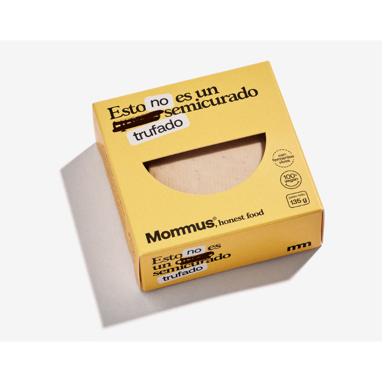 Mommus Esto No es un Semicurado Trufado, un delicioso sustituto vegetal del queso semicurado elaborado artesanalmente a base de anacardos. Este fermentado vegano se cultiva con fermentos naturales y se estaciona en cámara para desarrollar una textura suave y cremosa en el interior, junto con una corteza característica de la maduración. Su sabor intenso y sofisticado, con elegantes matices de trufa blanca y un toque ahumado, lo convierte en una alternativa gourmet ideal para tablas, aperitivos y recetas veganas. Además, contiene probióticos naturales que aportan valor nutricional y favorecen la digestión. Una opción 100% vegetal perfecta para quienes buscan disfrutar del sabor del semicurado de forma sostenible y saludable.